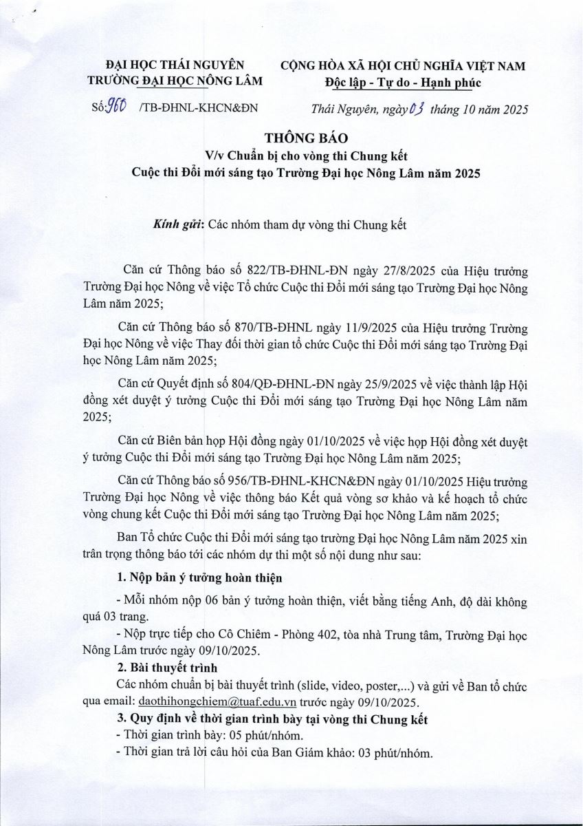 → Thông báo Tổ chức cuộc thi Đổi mới sáng tạo Trường Đại học Nông Lâm năm 2025 (08/2025)