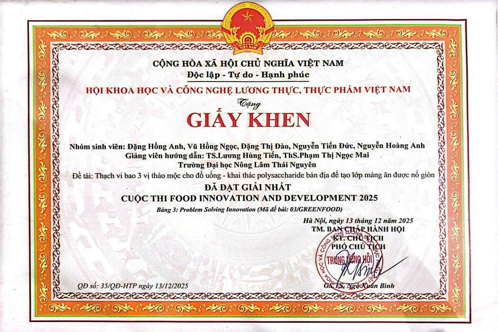 + Giải Khuyến khích Bảng 2 (Food security & Social impact) cho đội thi EcoTea (Nhóm sinh viên: Nguyễn Công Dương, Cao Thị Thuỳ Chi, Võ Thị Thuý An, Phạm Thanh Hằng, Ikechukwu Franklin Ekeh) với đề tài: Phát triển sản phẩm từ lá già chè búp tím Thái Nguyên do TS. Đinh Thị Kim Hoa và ThS. Lưu Hồng Sơn hướng dẫn.