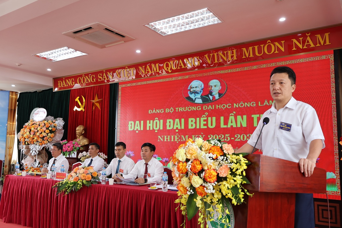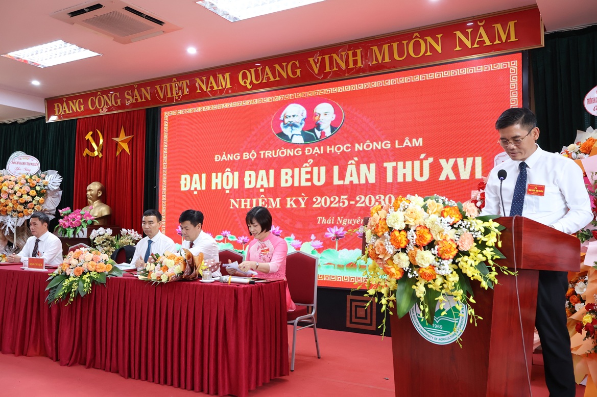 Phát biểu chúc mừng và chỉ đạo tại Đại hội, đồng chí Hoàng Văn Hùng - UV BTV Đảng ủy, Giám đốc ĐHTN đã biểu dương những thành tích của Đảng bộ Nhà trường đạt được trong nhiệm kỳ vừa qua. Đồng chí nhấn mạnh những thành tích đạt được có ý nghĩa quan trọng, tạo tiền đề cho Nhà trường phát triển mạnh mẽ trong những năm tiếp theo. Đồng chí mong rằng trong nhiệm kỳ tới, Đảng bộ Nhà trường cần khắc phục những hạn chế, khuyết điểm; tiếp tục phát huy tinh thần đoàn kết, chủ động sáng tạo, tập trung, quan tâm đến công tác giáo dục tư tưởng chính trị cho Đảng viên; duy trì tốt chế độ và nâng cao chất lượng sinh hoạt Đảng bộ, Chi bộ, cải tiến, đổi mới hơn nữa. Đồng chí tin rằng Trường Đại học Nông Lâm sẽ hoàn thành thắng lợi mục tiêu Đại hội đề ra, sớm hiện thực hóa khát vọng trở thành đại học tự chủ, đa ngành, hội nhập quốc tế, đóng góp xứng đáng vào sự nghiệp giáo dục đào tạo, khoa học công nghệ và phát triển vùng trung du miền núi phía Bắc.