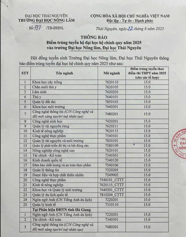 Điểm trúng tuyển hệ đại học chính quy năm 2025 vào trường Đại học Nông Lâm, Đại học Thái Nguyên