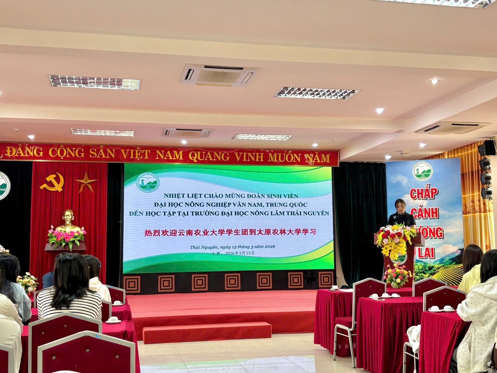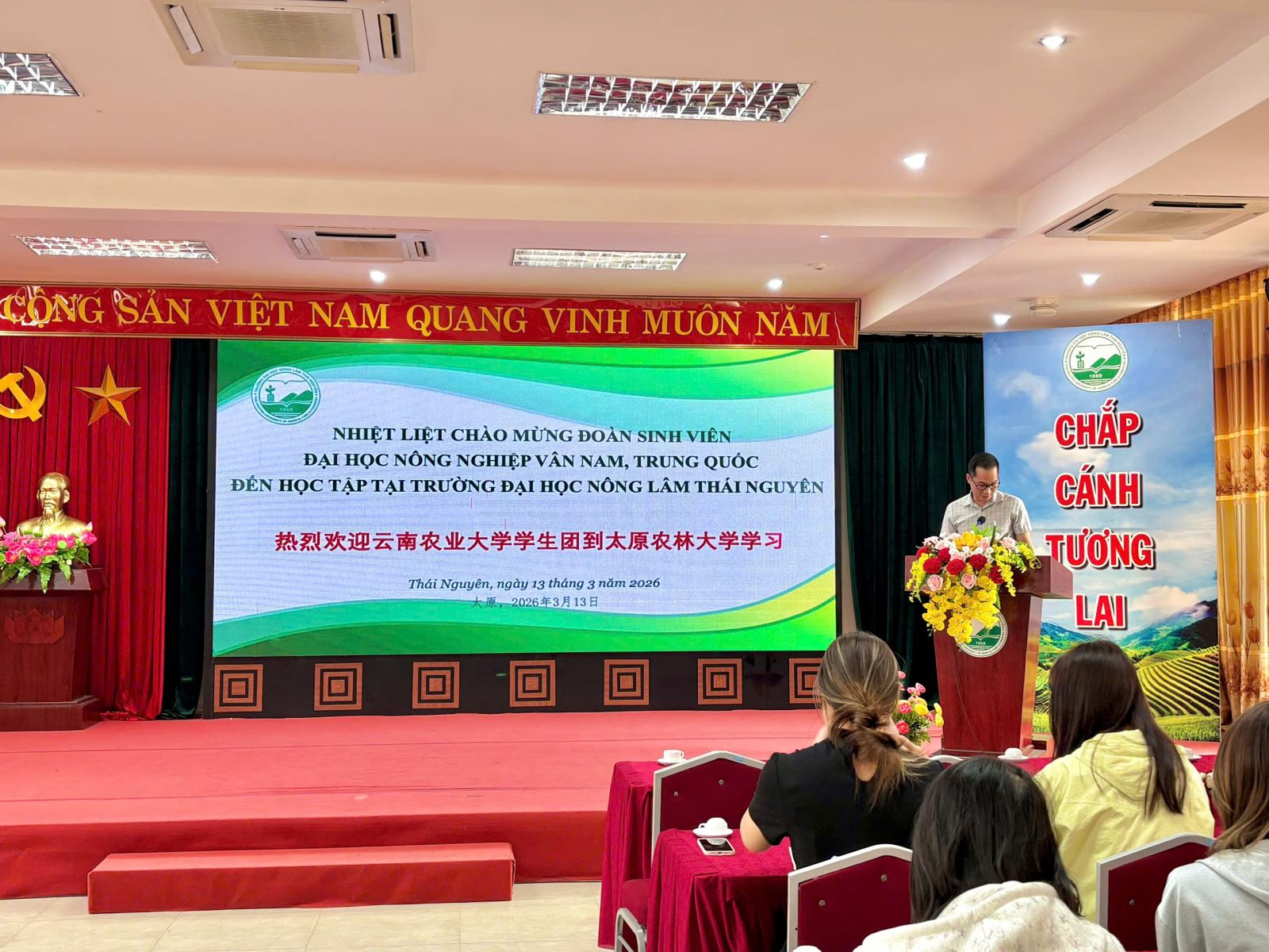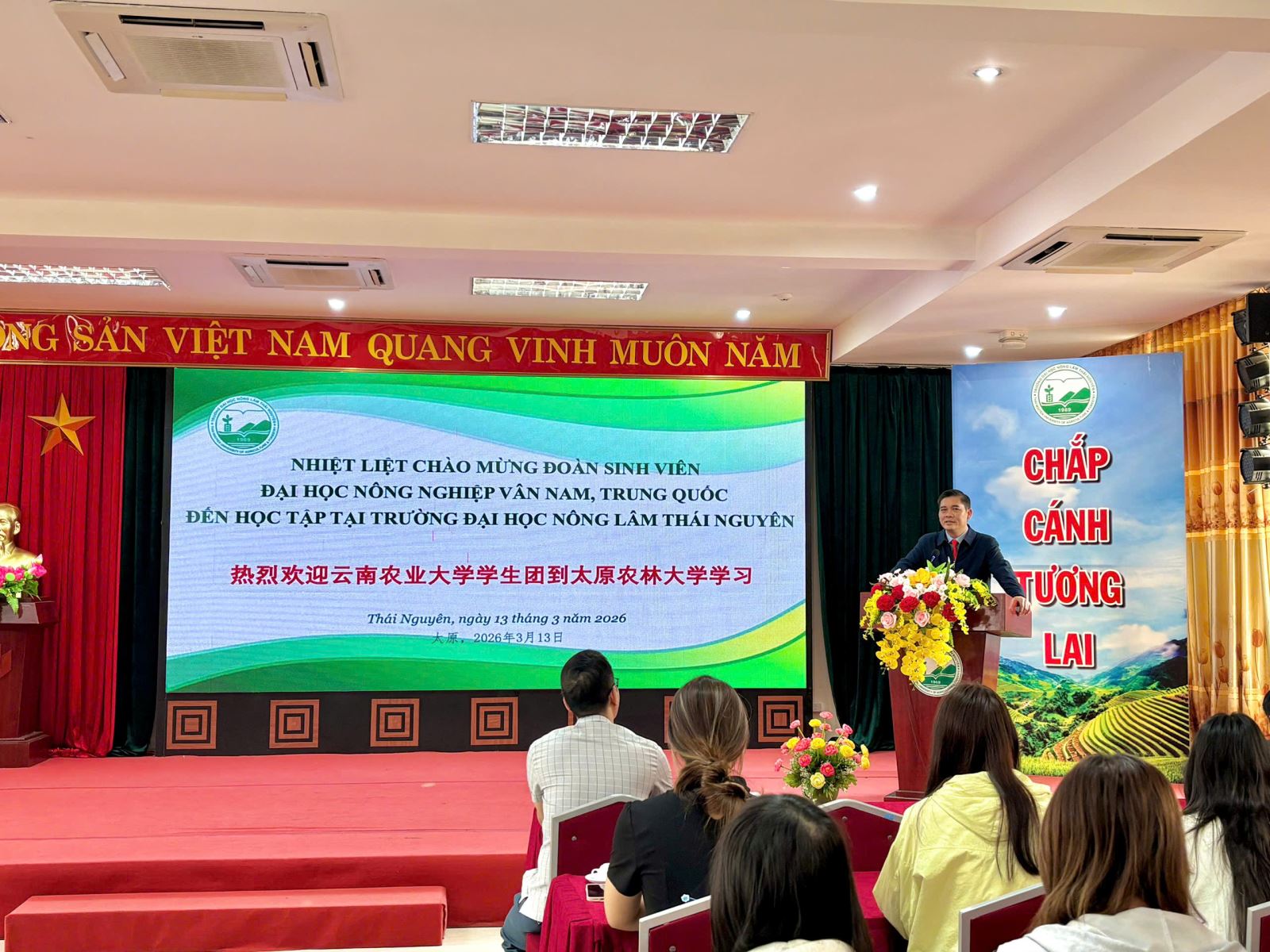 Tại buổi gặp mặt, TS Nguyễn Chí Hiểu - Bí thư Đảng uỷ, Phó Hiệu trưởng Trường Đại học Nông Lâm Thái Nguyên đã có bài phát biểu chào mừng đoàn sinh viên. Trong bài phát biểu, Thầy bày tỏ sự vui mừng khi được đón tiếp các bạn sinh viên đến học tập tại trường, đồng thời nhấn mạnh mối quan hệ hợp tác tốt đẹp giữa Trường Đại học Nông Lâm Thái Nguyên và Trường Đại học Nông nghiệp Vân Nam trong nhiều năm qua, đặc biệt trong các hoạt động trao đổi sinh viên, hợp tác đào tạo và giao lưu học thuật. Thầy Phó Hiệu trưởng cũng chia sẻ rằng chương trình học tiếng Việt không chỉ giúp các sinh viên nâng cao năng lực ngôn ngữ, mà còn là cơ hội để các bạn tìm hiểu sâu hơn về văn hóa, con người và đời sống tại Việt Nam. Nhà trường mong rằng trong thời gian học tập và sinh hoạt tại Thái Nguyên, các sinh viên sẽ có nhiều trải nghiệm ý nghĩa, tích lũy thêm kiến thức và kỷ niệm đáng nhớ, đồng thời trở thành cầu nối góp phần thúc đẩy mối quan hệ hợp tác và giao lưu văn hóa giữa hai quốc gia.