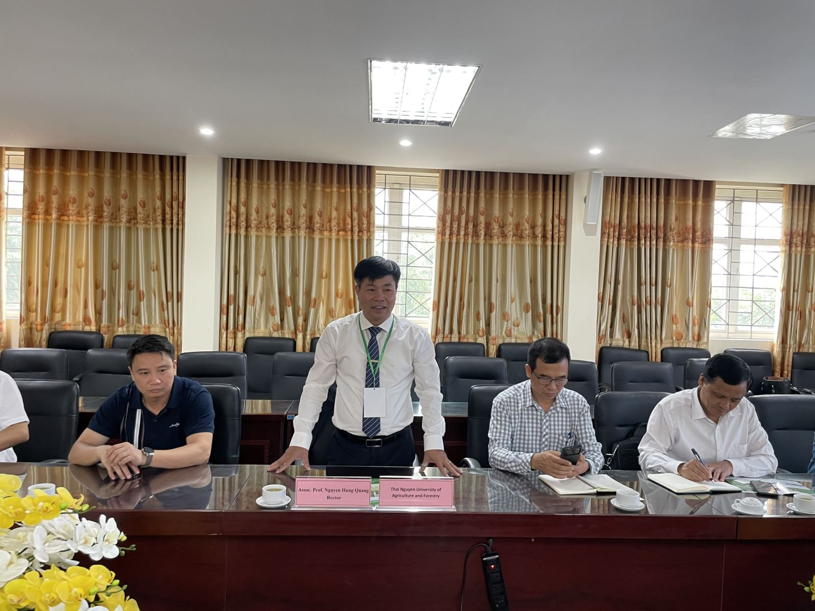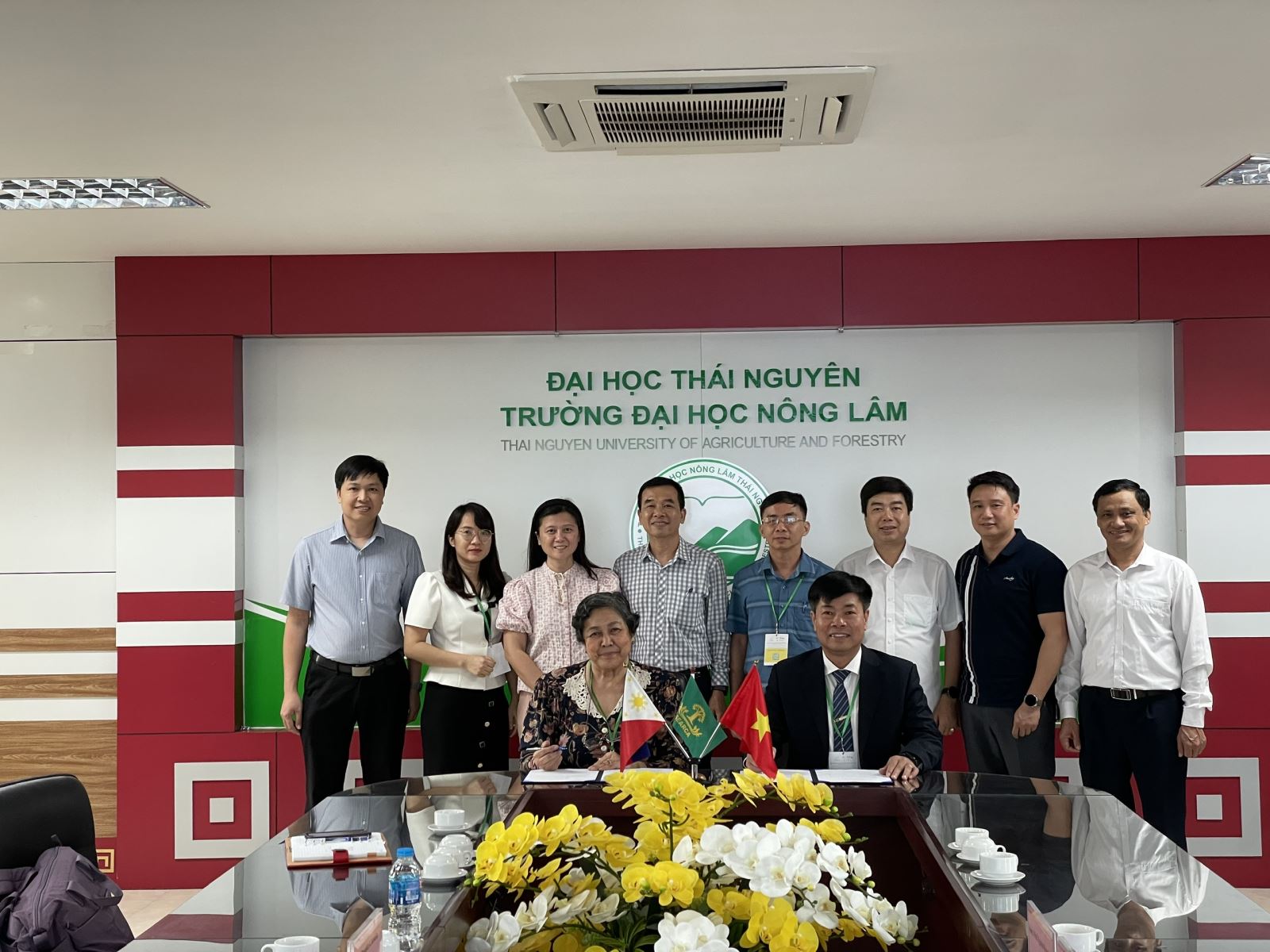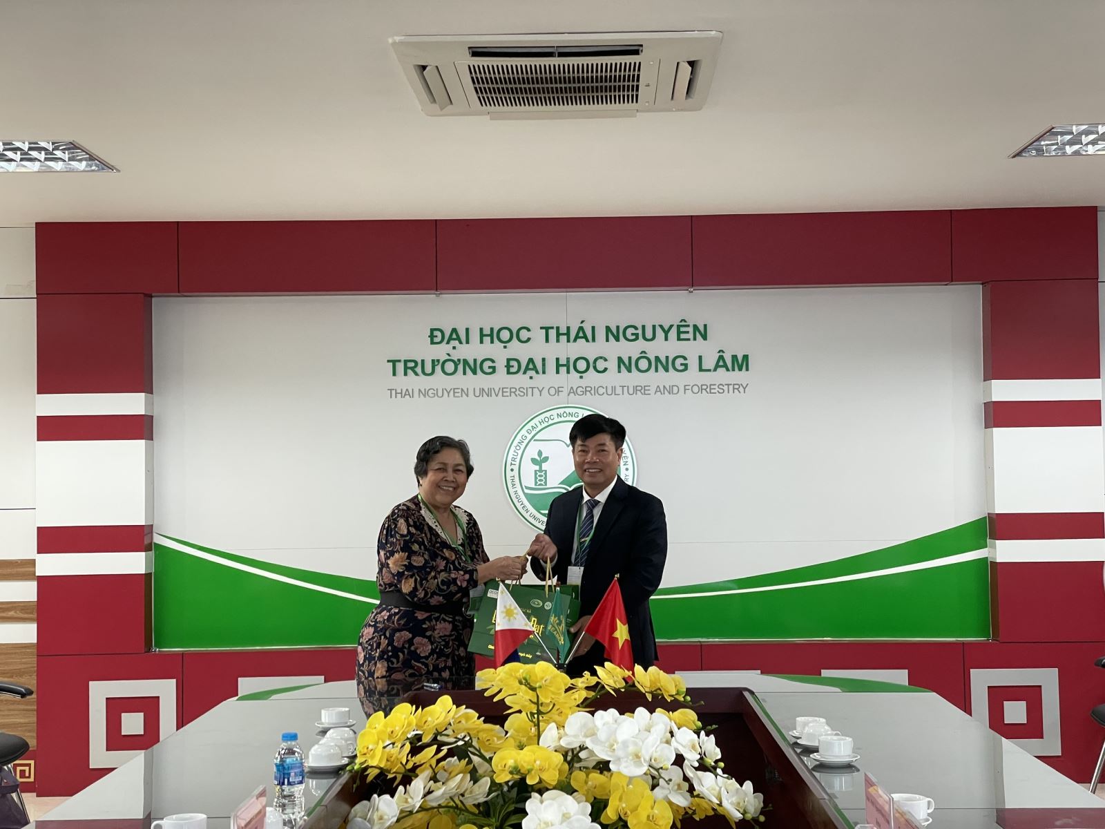 Tiếp và làm việc với đoàn SEARCA có PGS.TS. Nguyễn Hưng Quang - Hiệu trưởng Nhà trường, TS. Dương Văn Thảo - Trưởng phòng KHCN & ĐN, TS. Nguyễn Thị Giang - Phó trưởng phòng KHCN & ĐN, PGS.TS. Trần Quốc Hưng - Phó trưởng Khoa Lâm nghiệp, TS. Trần Văn Thăng - Phó trưởng Khoa Chăn nuôi thú y, TS. Triệu Xuân Hòa - Phó trưởng phòng Đào tạo và các Thầy cô cựu học viên của Philippines.