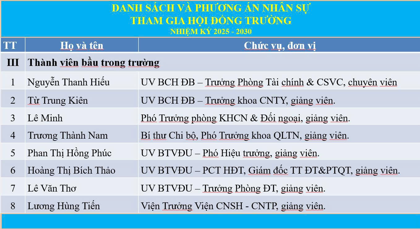 Đề án thành lập Hội đồng Trường nhiệm kỳ 2025-2030 gồm 21 thành viên. Trong đó, thành viên trong Trường là 13 người, đại diện cho tập thể viên chức, người lao động, sinh viên trong Trường (gồm 04 thành viên đương nhiên và 08 thành viên được bầu), thành viên ngoài Trường là 09 người, đại diện cho cộng đồng xã hội (gồm 01 thành viên đương nhiên và 08 thành viên được bầu).