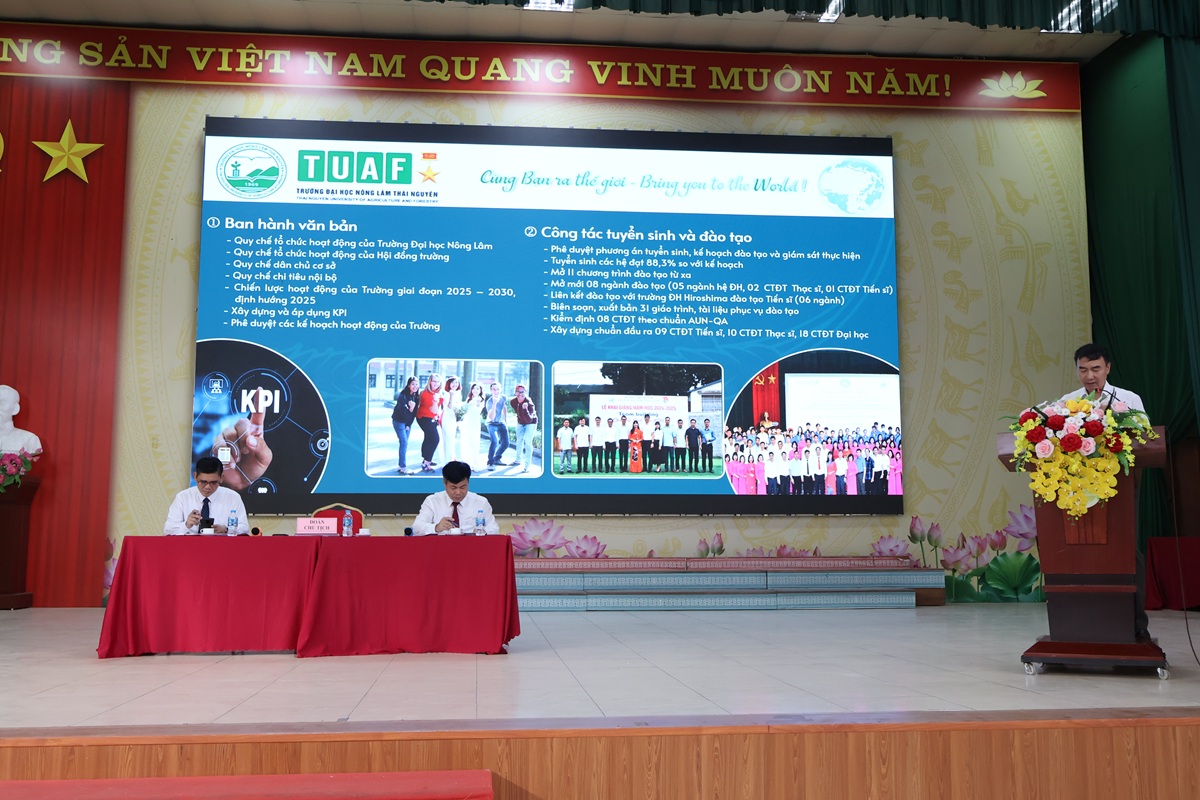 Phát biểu khai mạc Hội nghị, GS.TS. Nguyễn Thế Hùng - Chủ tịch Hội đồng Trường nhiệm kỳ 2020-2025 đã trình bày báo cáo tóm tắt hoạt động, kết quả thực hiện nhiệm vụ của Hội đồng Trường nhiệm kỳ 2020-2025. Trong đó khẳng định, các nghị quyết của Hội đồng Trường được ban hành kịp thời, phù hợp với các quy định hiện hành và thực tiễn phát triển của Nhà trường, từ đó góp phần nâng cao hiệu quả và hiệu lực hoạt động của Hội đồng Trường, đồng thời cải thiện năng lực quản trị tại Trường Đại học Nông Lâm.