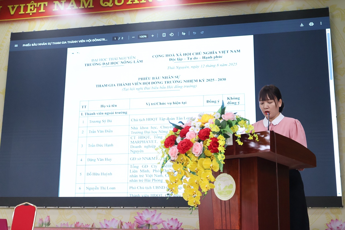 Quy trình bỏ phiếu diễn ra nghiêm túc, công khai, minh bạch, Hội nghị đã bầu được các thành viên tham gia Hội đồng trường Trường Đại học Nông Lâm nhiệm kỳ 2025-2030 là những cá nhân ưu tú, tâm huyết, đại diện cho tập thể viên chức, người lao động, sinh viên trong Trường và các tổ chức xã hội.