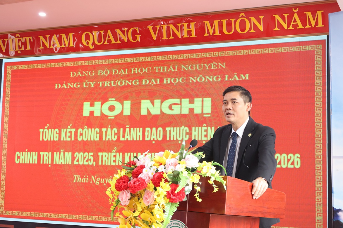 Tại Hội nghị, đồng chí Nguyễn Chí Hiểu - Bí thư Đảng ủy đã trình bày báo cáo tổng kết công tác lãnh đạo năm 2025. Báo cáo nhấn mạnh: Công tác xây dựng Đảng được triển khai nghiêm túc, hiệu quả; chất lượng sinh hoạt chi bộ và năng lực lãnh đạo của các cấp ủy được nâng cao rõ rệt. Hoạt động đào tạo, bồi dưỡng và kiểm định chất lượng tiếp tục đạt nhiều kết quả tích cực; các chương trình đào tạo được rà soát, đổi mới phù hợp yêu cầu thực tiễn. Công tác nghiên cứu khoa học, chuyển giao công nghệ tiếp tục khẳng định vị thế của Nhà trường trong khối các trường đại học chuyên ngành nông - lâm - môi trường. Công tác đối ngoại, hợp tác quốc tế mở rộng theo chiều sâu; nhiều dự án hợp tác mới được ký kết và triển khai hiệu quả. Công tác sinh viên, an ninh trật tự, an sinh phúc lợi, chuyển đổi số và xây dựng cơ sở vật chất đều đạt nhiều kết quả nổi bật.