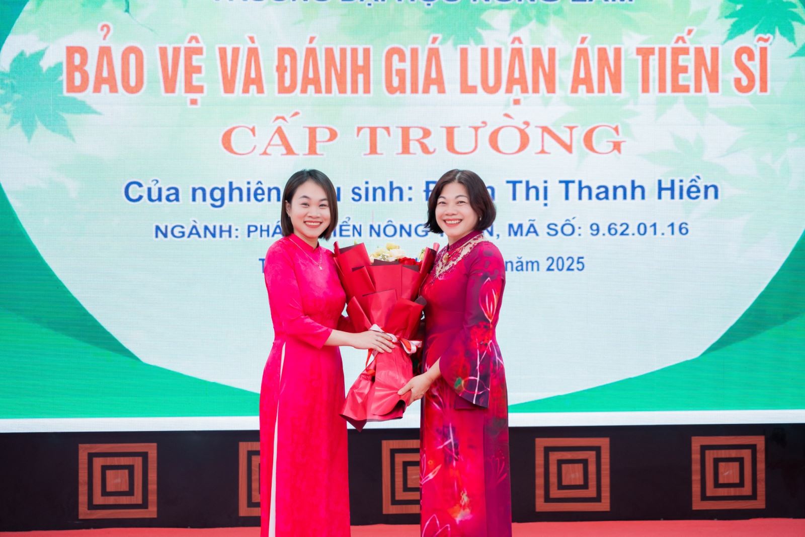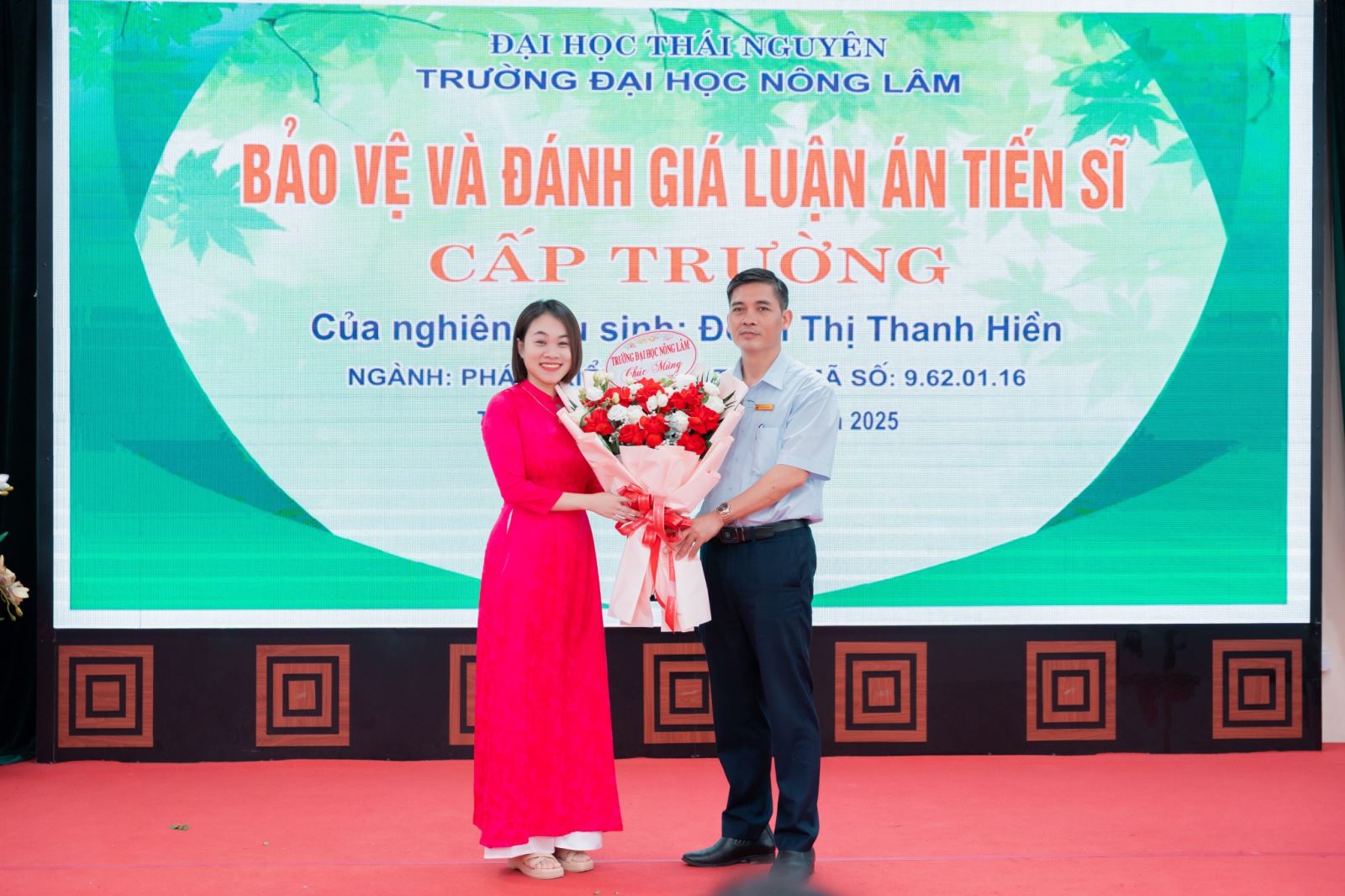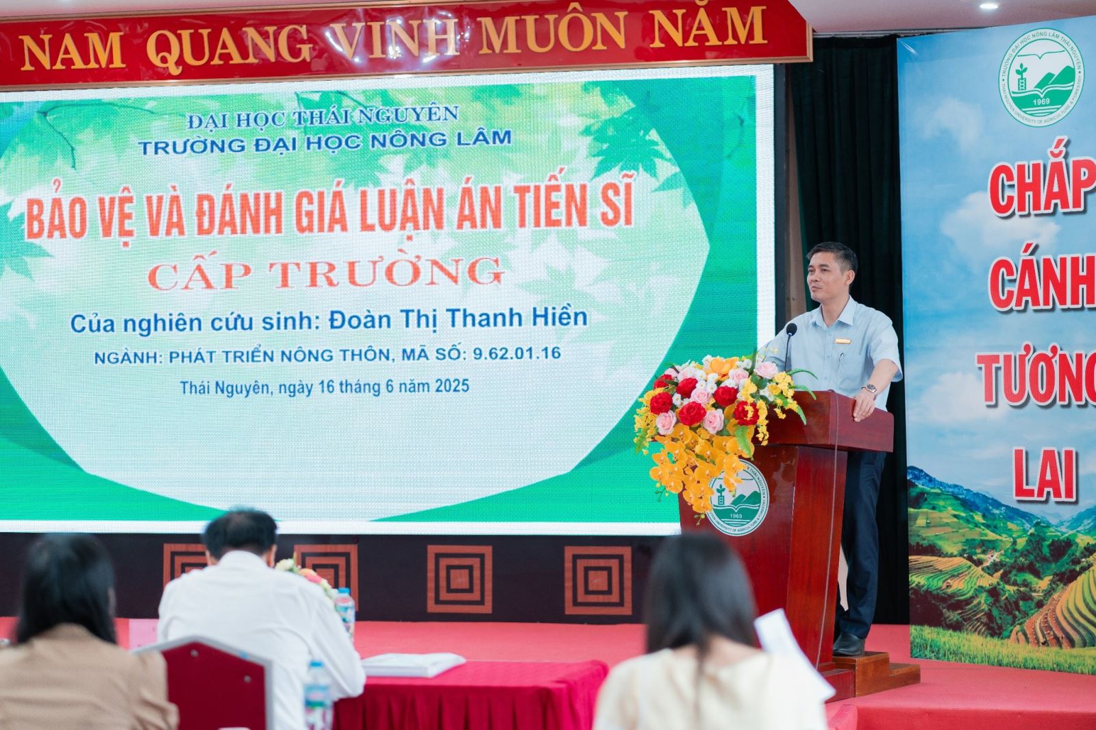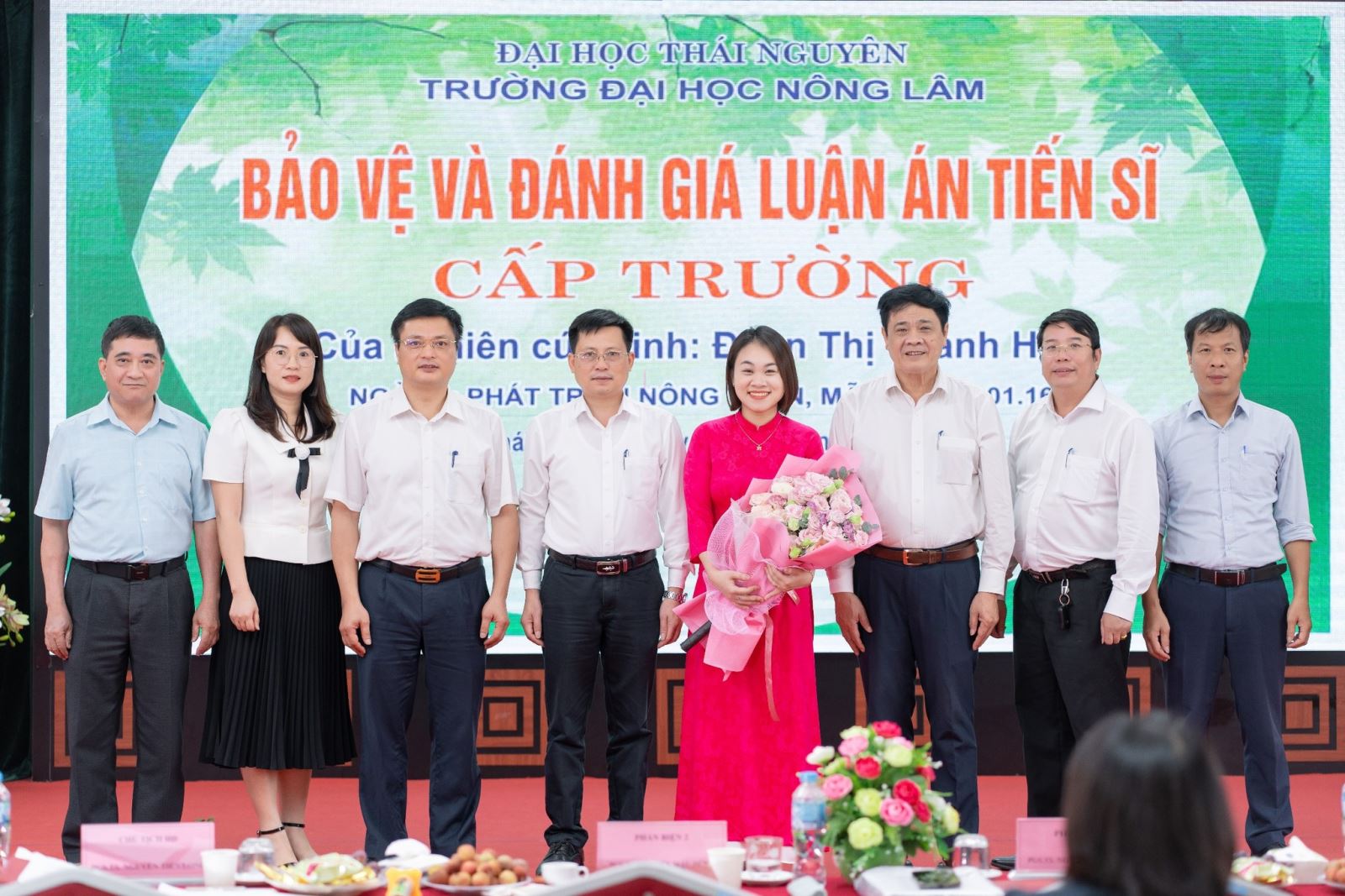 Buổi bảo vệ luận án được tiến hành đúng theo quy định của Bộ Giáo dục và Đào tạo, Đại học Thái Nguyên, và Trường Đại học Nông Lâm trong không khí trang trọng, với sự chứng kiến của tập thể cán bộ hướng dẫn khoa học, đại diện Ban chủ nhiệm khoa Kinh tế và Phát triển nông thôn, Ban Giám hiệu Trường Đại học Nông Lâm là đơn vị đào tạo, các nhà khoa học, đồng nghiệp, các NCS, học viên cao học, sinh viên, gia đình và bạn bè của NCS.