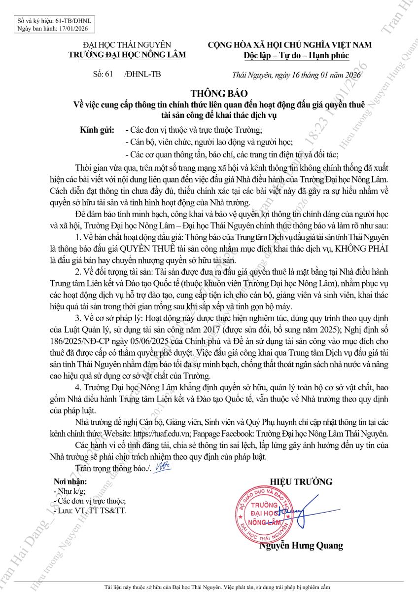 Thông báo chính thức về việc đấu giá quyền thuê khai thác dịch vụ tại trường ĐH Nông Lâm Thái Nguyên